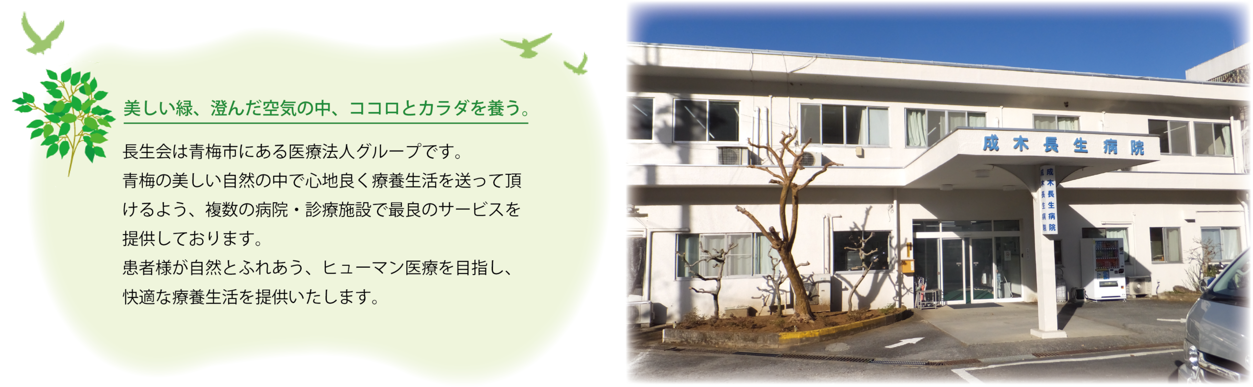 長生会は、患者様やご家族様と相互理解を深め、お互いに信頼し協力しあえる環境をつくり、人間愛に満ちた医療の提供を志し、皆様と共に歩める病院を目指します。